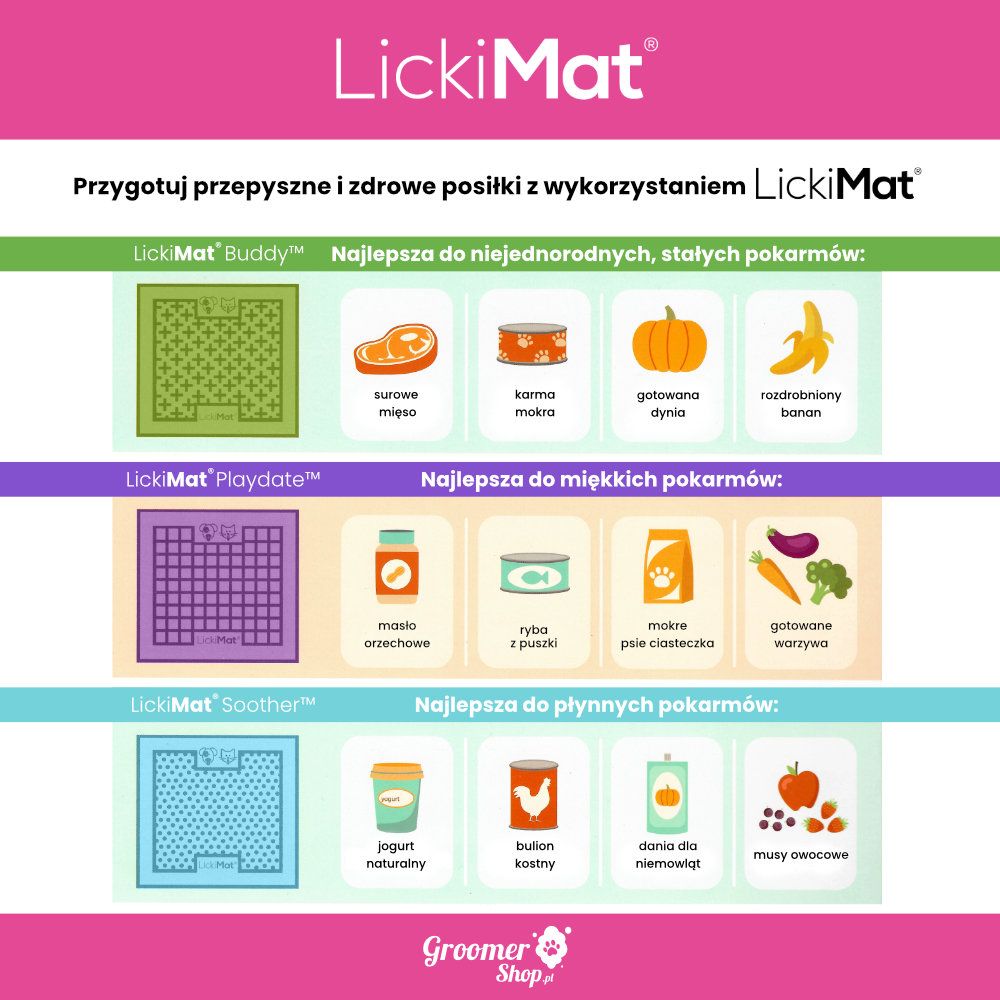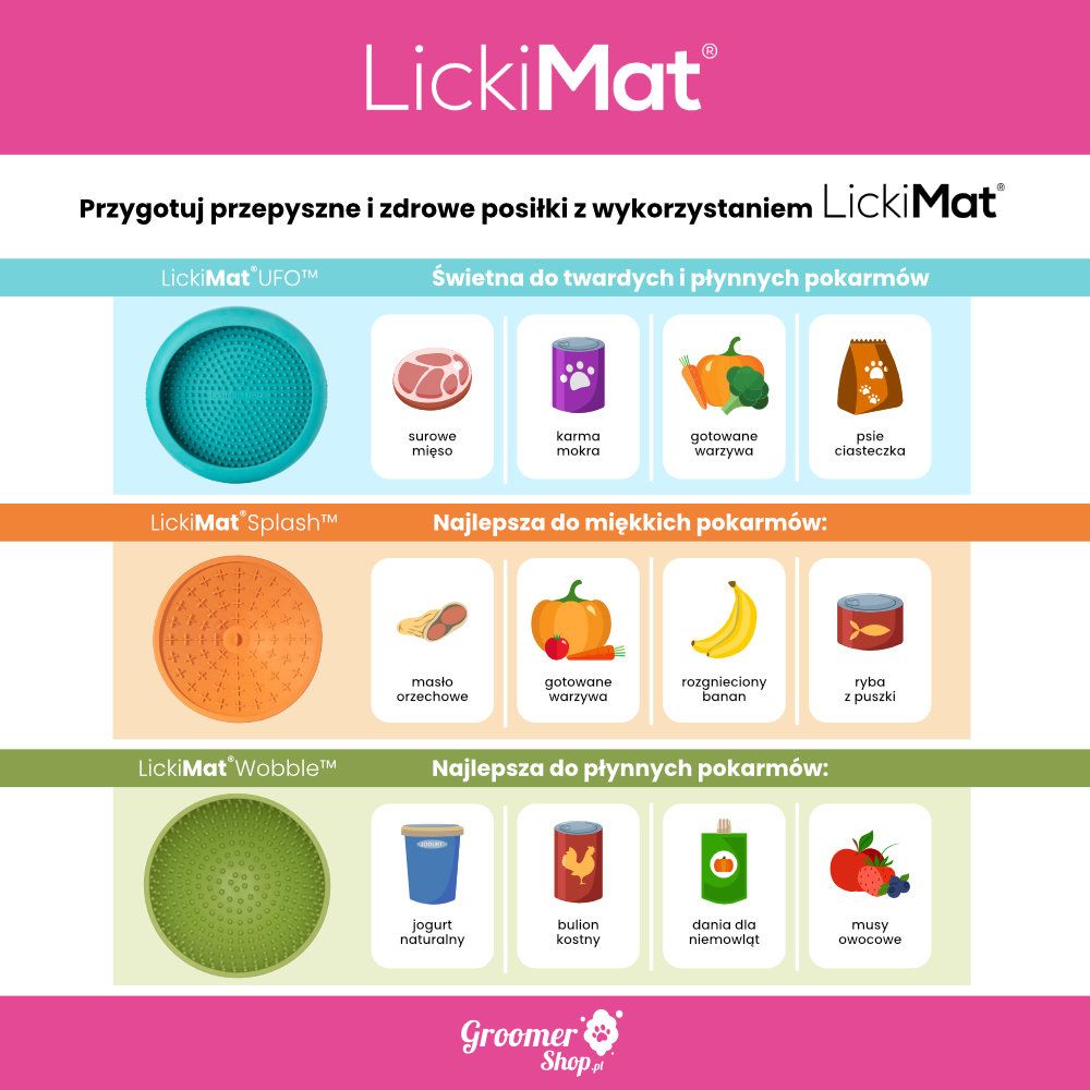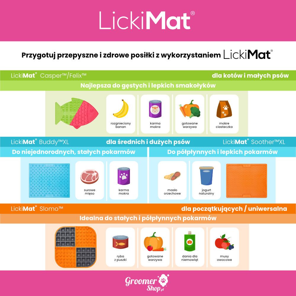 LickiMat to innowacyjne maty/tacki do lizania dla psów i kotów, które łączą w sobie funkcje relaksu, karmienia i zabawy. Różne powierzchnie mat i rozsmarowane na nich smakołyki (pasty, musy, pasztety, itp.) zachęcają czworonogi do lizania, by wydobyć pożywienie. Długotrwałe wylizywanie i węszenie działa relaksująco i odprężająco na zwierzę, ponieważ powoduje wydzielanie endorfin. W ten sposób maty LickiMat sprawiaja, że jedzenie staje się bardziej angażujące, uspokajające i zajmie Twojemu pupilowi więcej czasu.